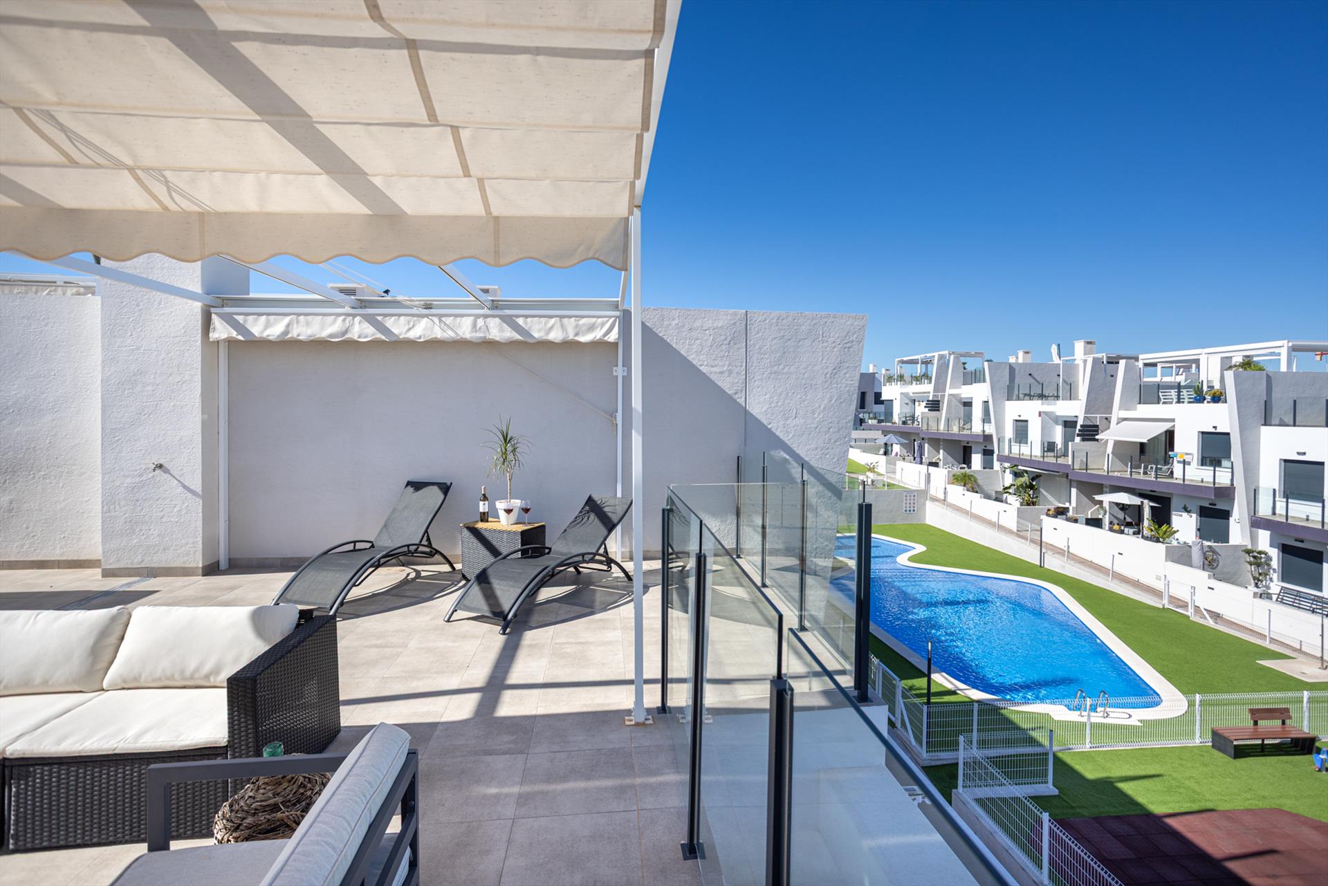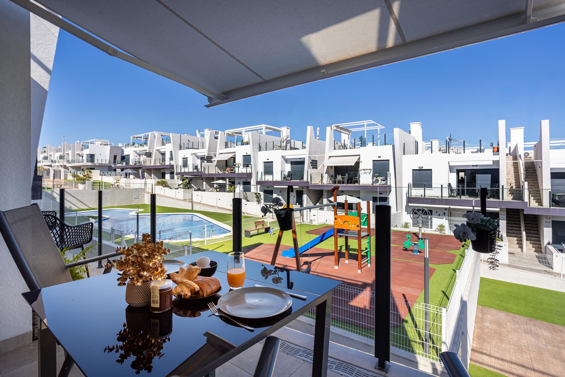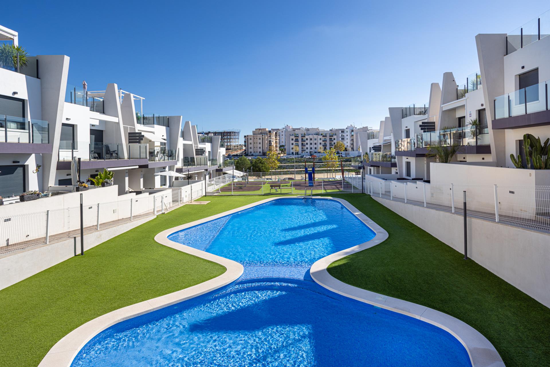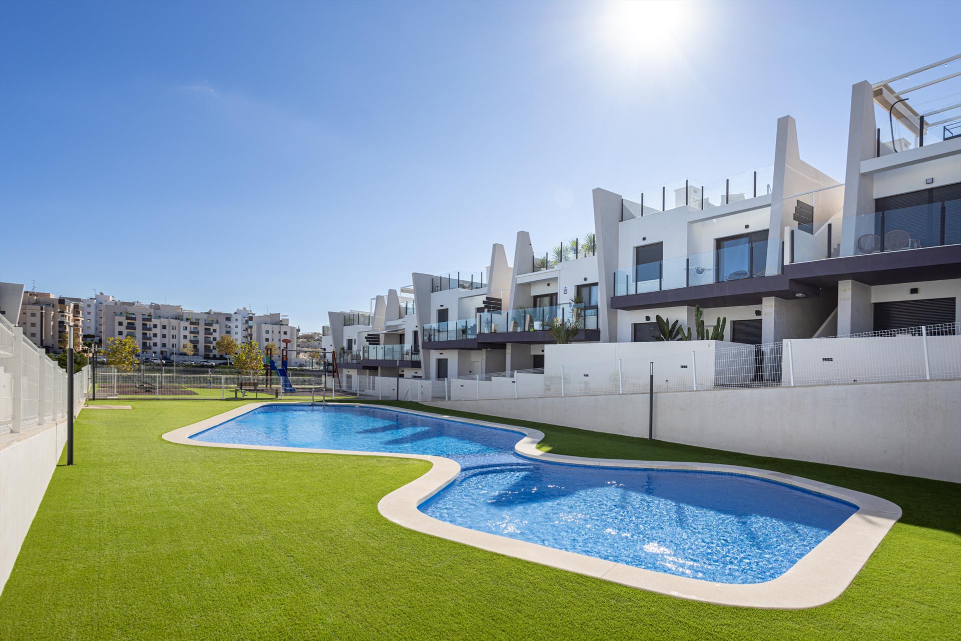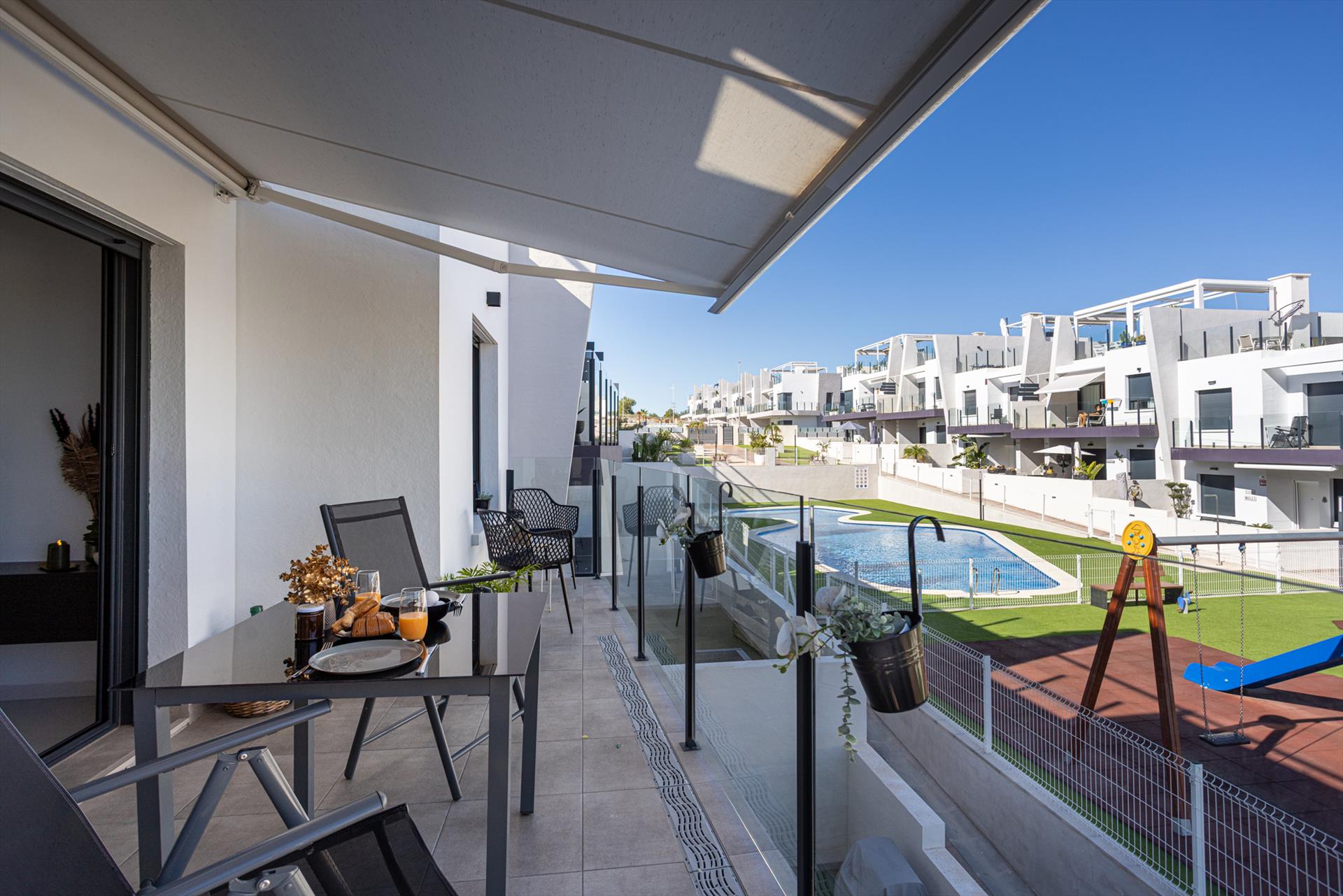 Disfruta del sol, la tranquilidad y el confort en el Apartamento Saoco Paraíso, un moderno y acogedor alojamiento vacacional con piscina comunitaria de estilo laguna y jardines verdes, ideal para unas vacaciones relajantes en la Costa Blanca.