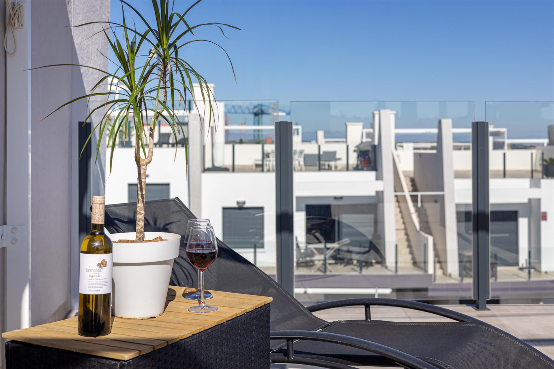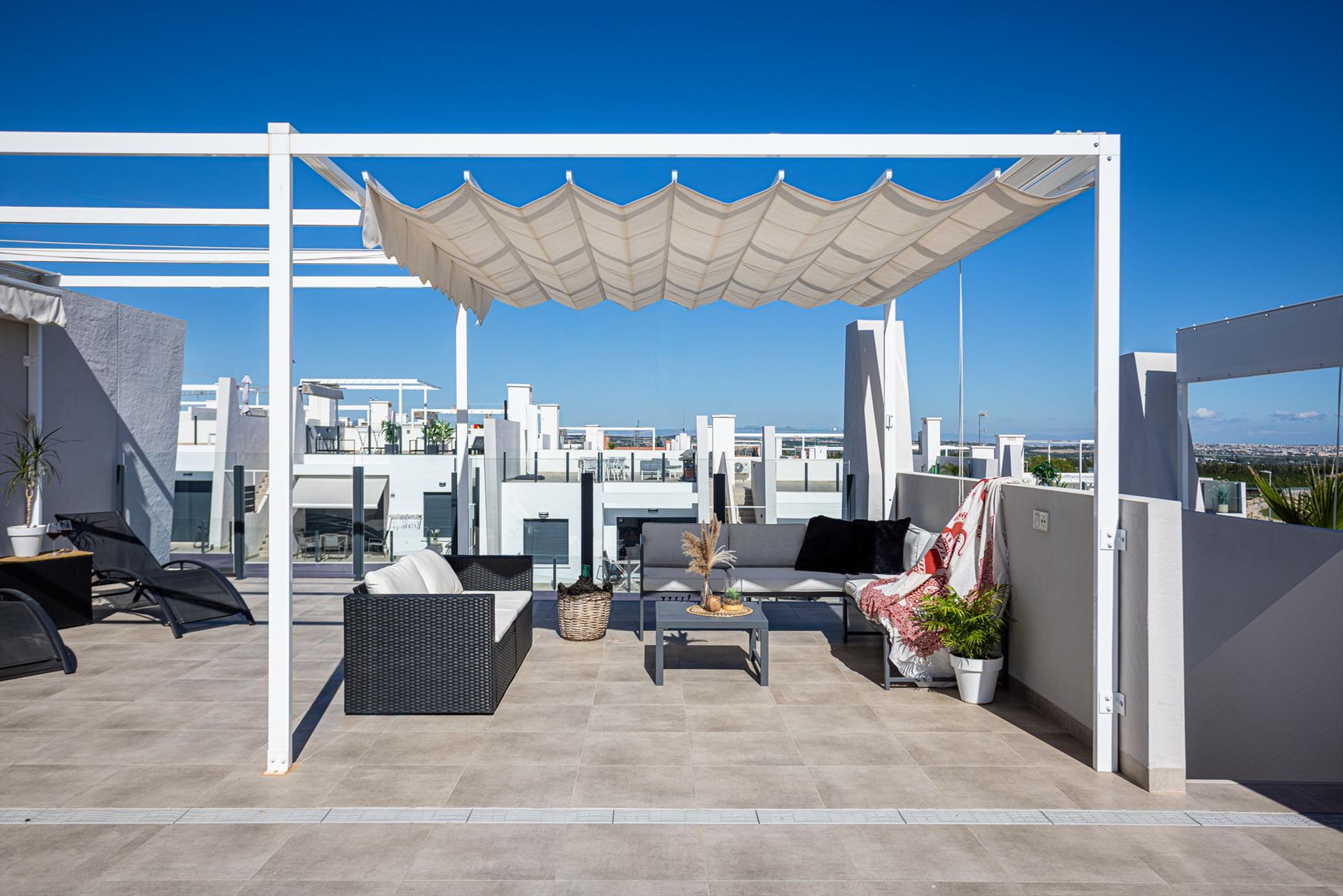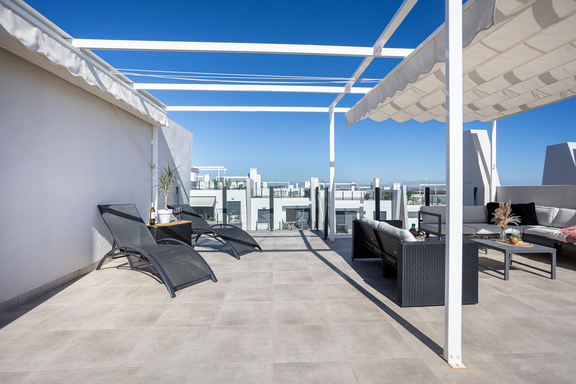 Solárium con zona de comedor, tumbonas y magníficas vistas