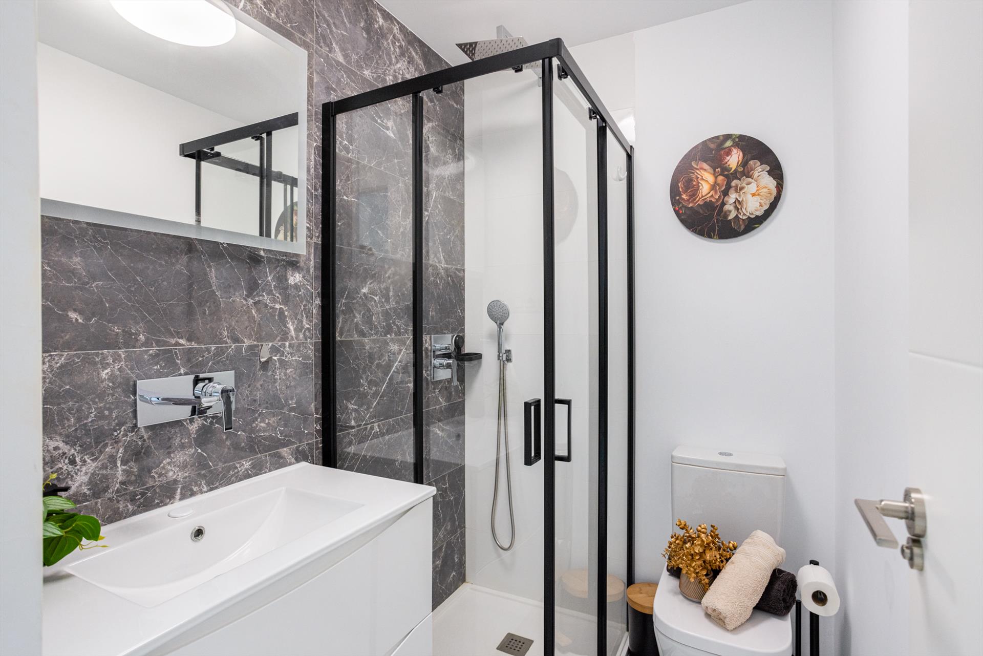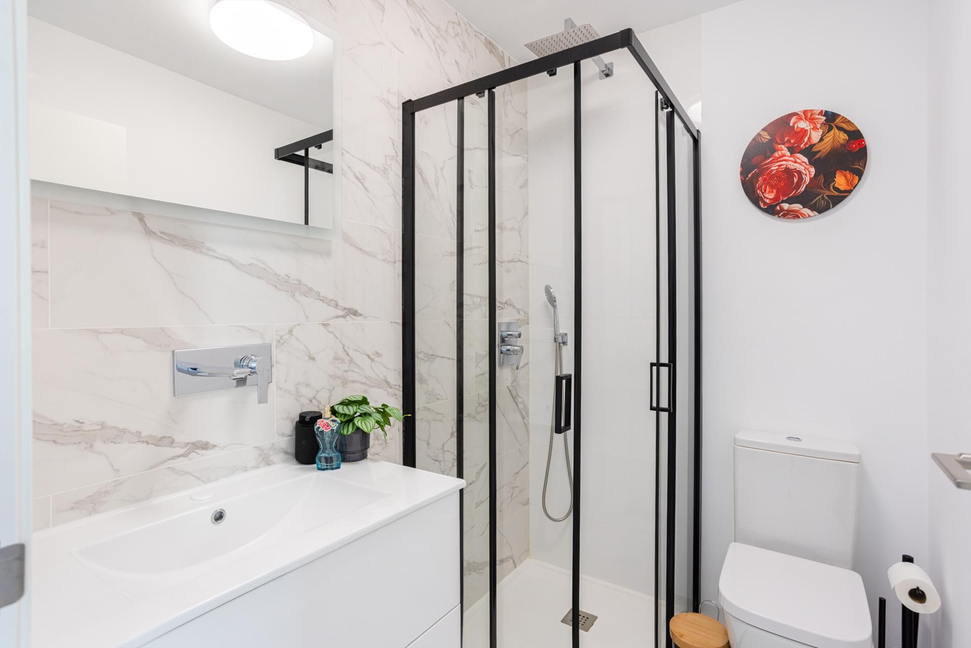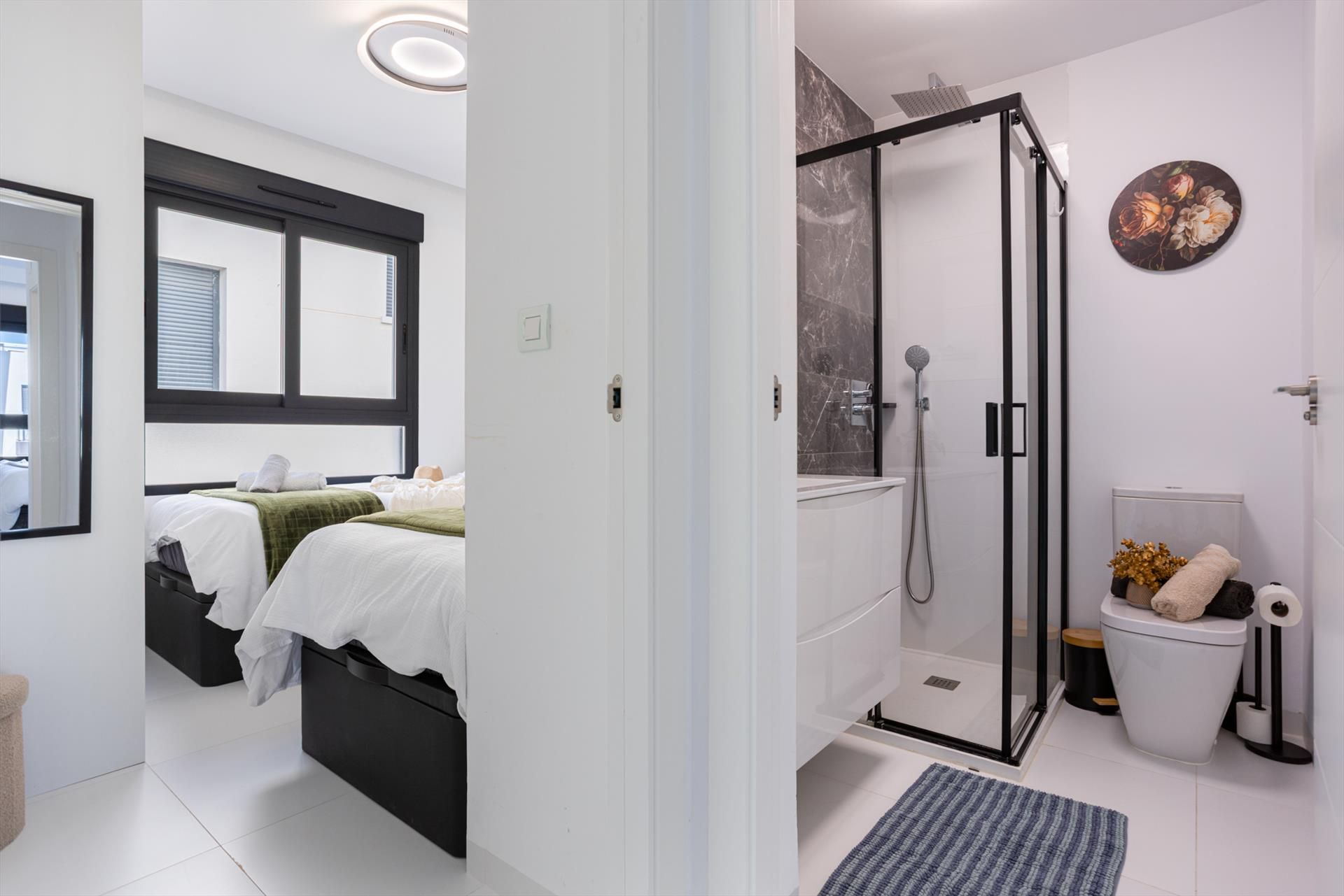- 2 baños, cada uno con lavabo individual, ducha, inodoro y secador de pelo