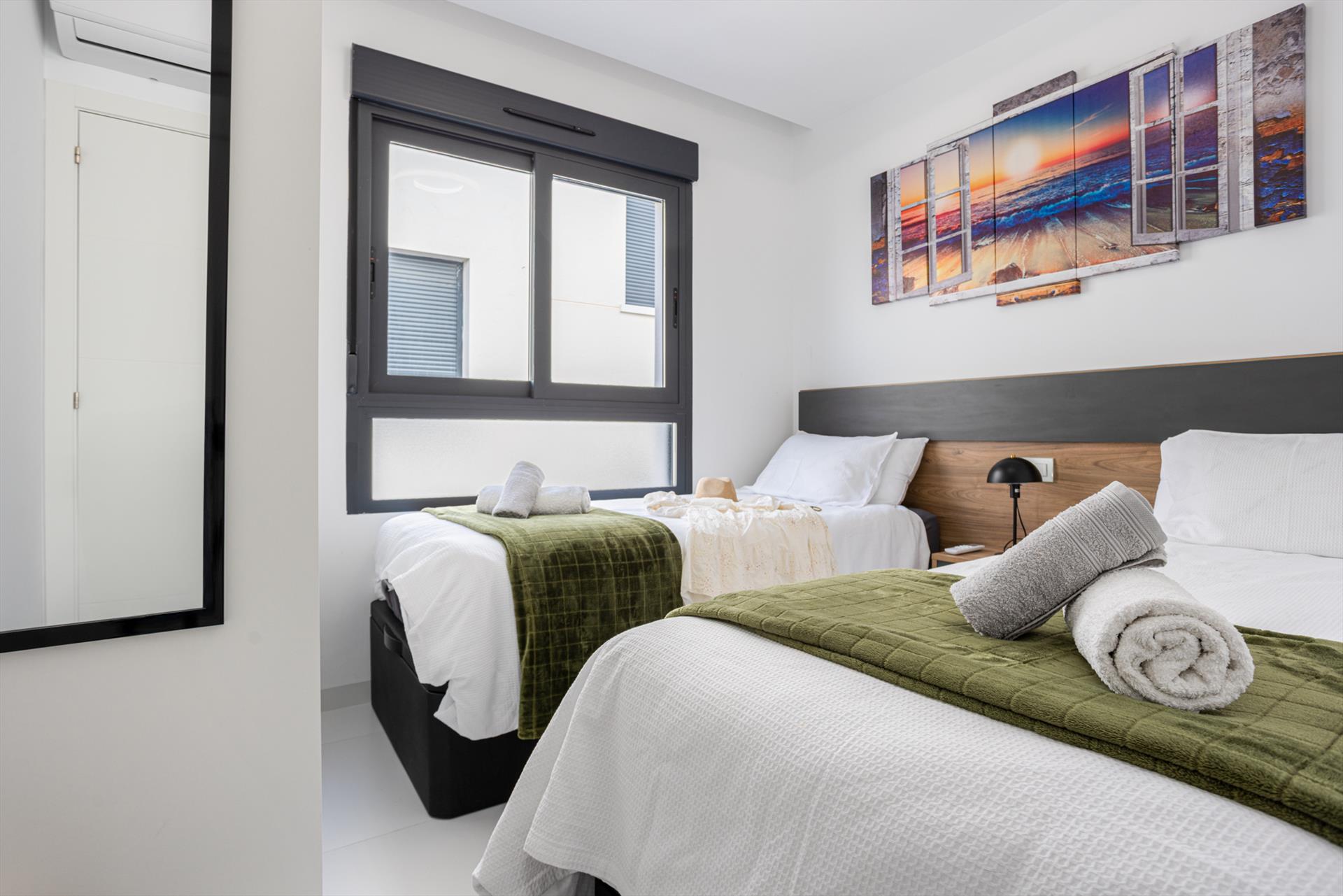 El apartamento cuenta con 2 dormitorios y 2 baños. La vivienda ofrece un jardín comunitario con césped y maravillosas vistas del jardín. Su confort y la cercanía a lugares para hacer compras, actividades deportivas y lugares de ocio hacen de este un excelente apartamento para pasar sus vacaciones en España con familia o amigos.