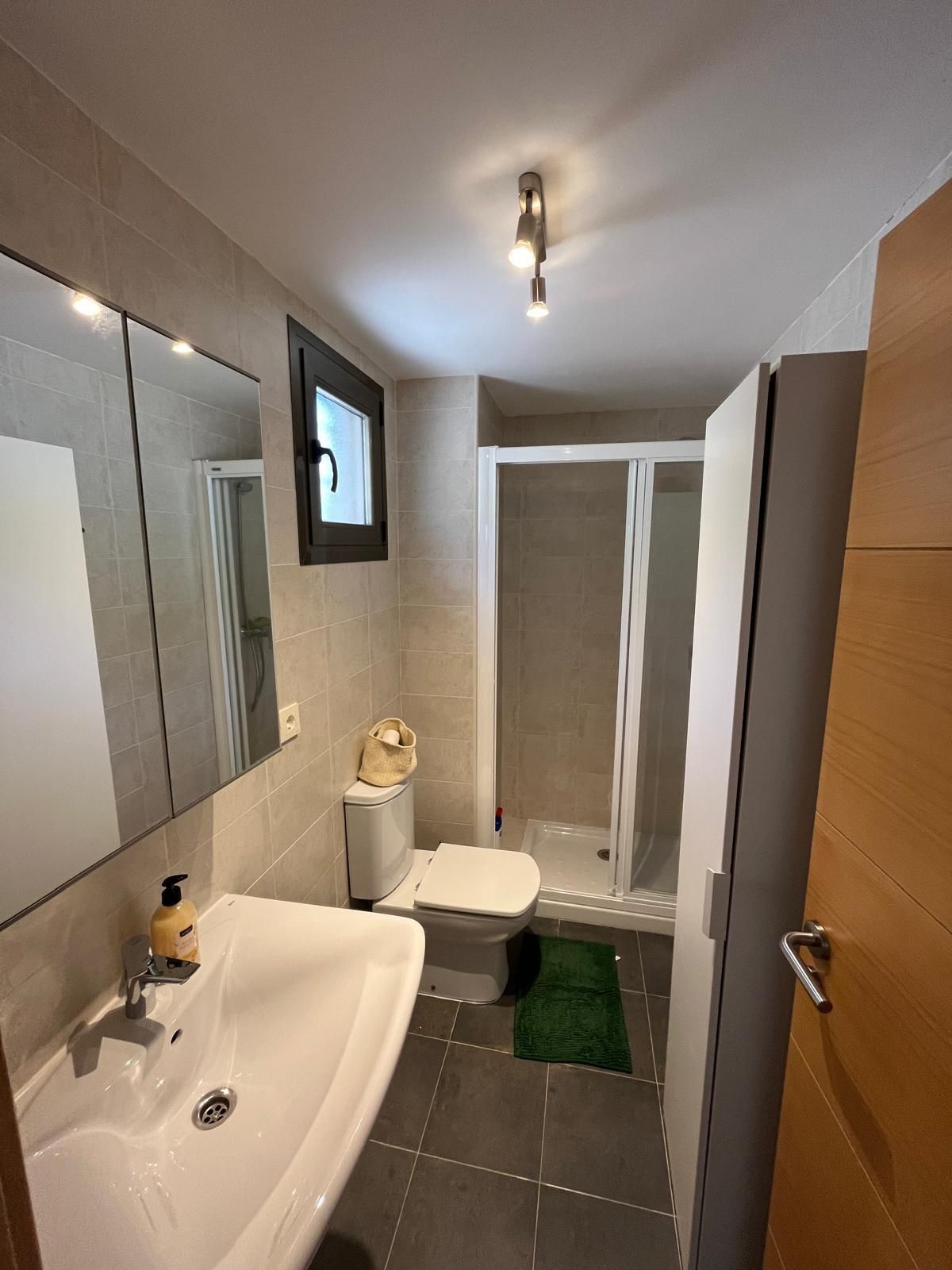 • bathroom with single washbasin, shower and toilet