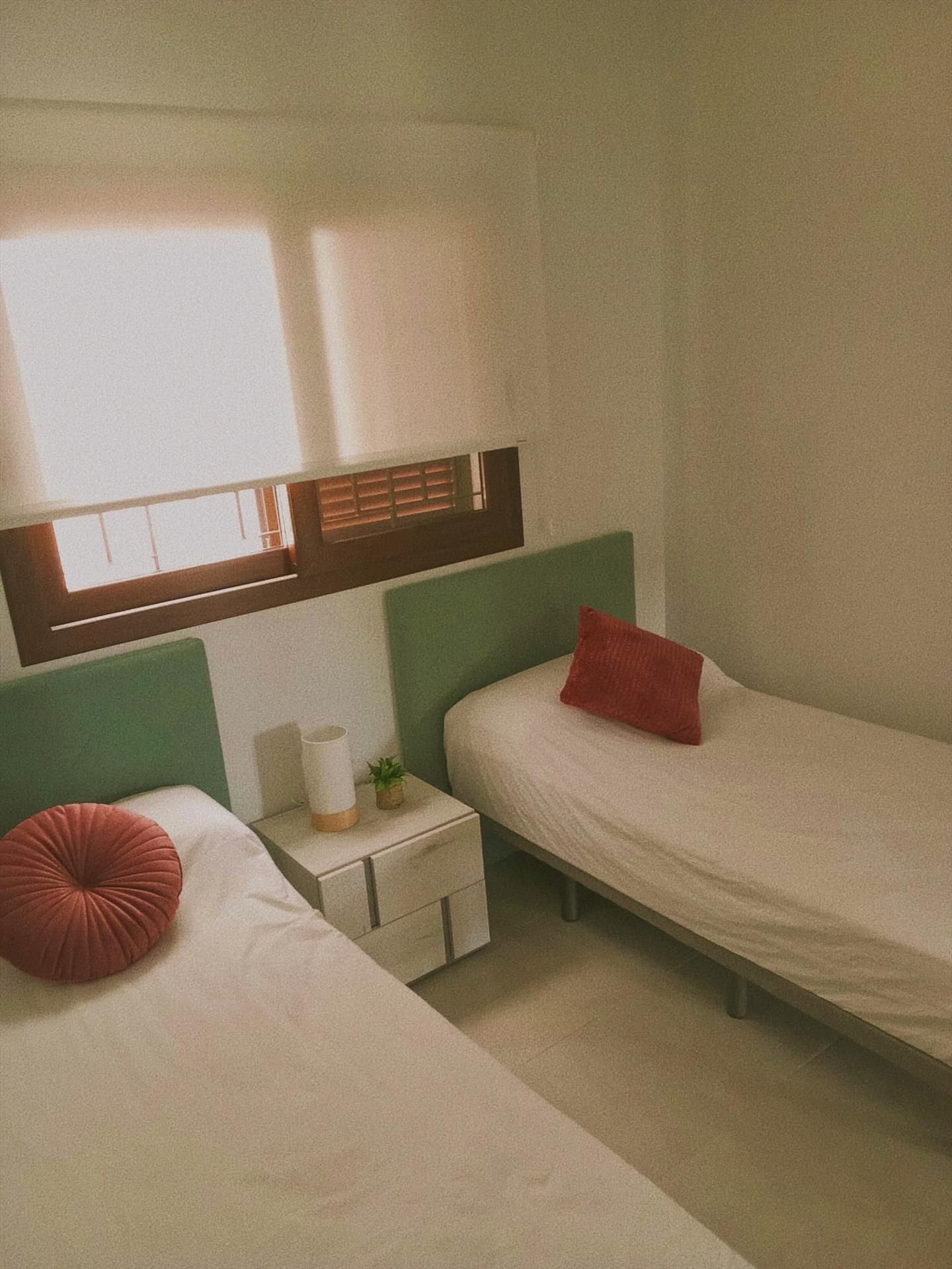 • bedroom with air conditioning and 2 single beds (measuring 200 by 80 cm)