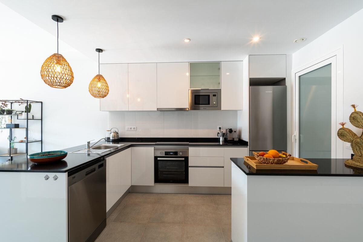 • open kitchen with induction cooker, electric oven, microwave, dishwasher, refrigerator-freezer, coffee machine, electric kettle, mixer, toaster, and juicer