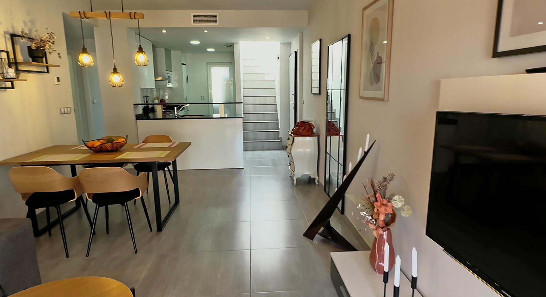 The apartment has 2 bedrooms and 2 bathrooms. The accommodation offers a garden with gravel, a lawned communal garden with trees and a view of the mountains. Its comfort and the proximity to the beach, places to shop, sports activities, entertainment facilities, sights and culture make this a fine apartment to spend your holidays in Spain with family or friends.