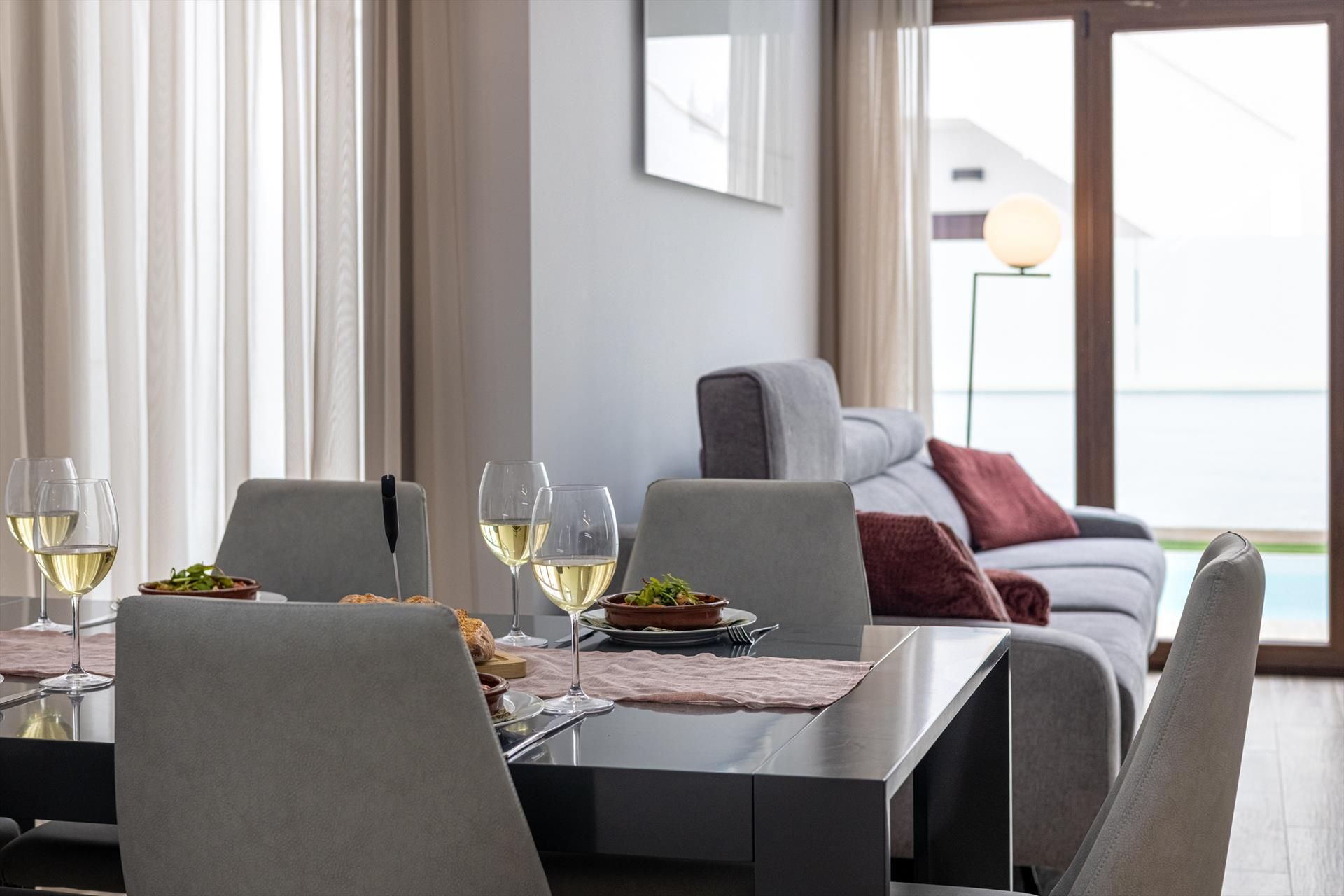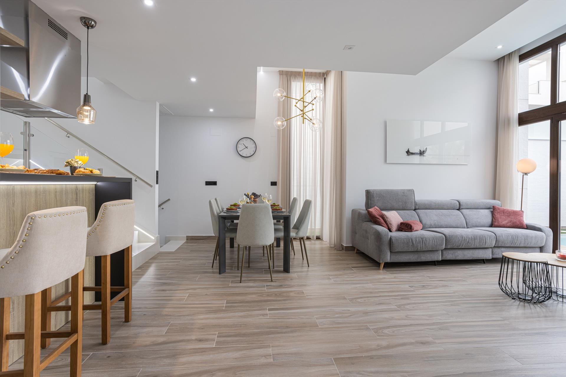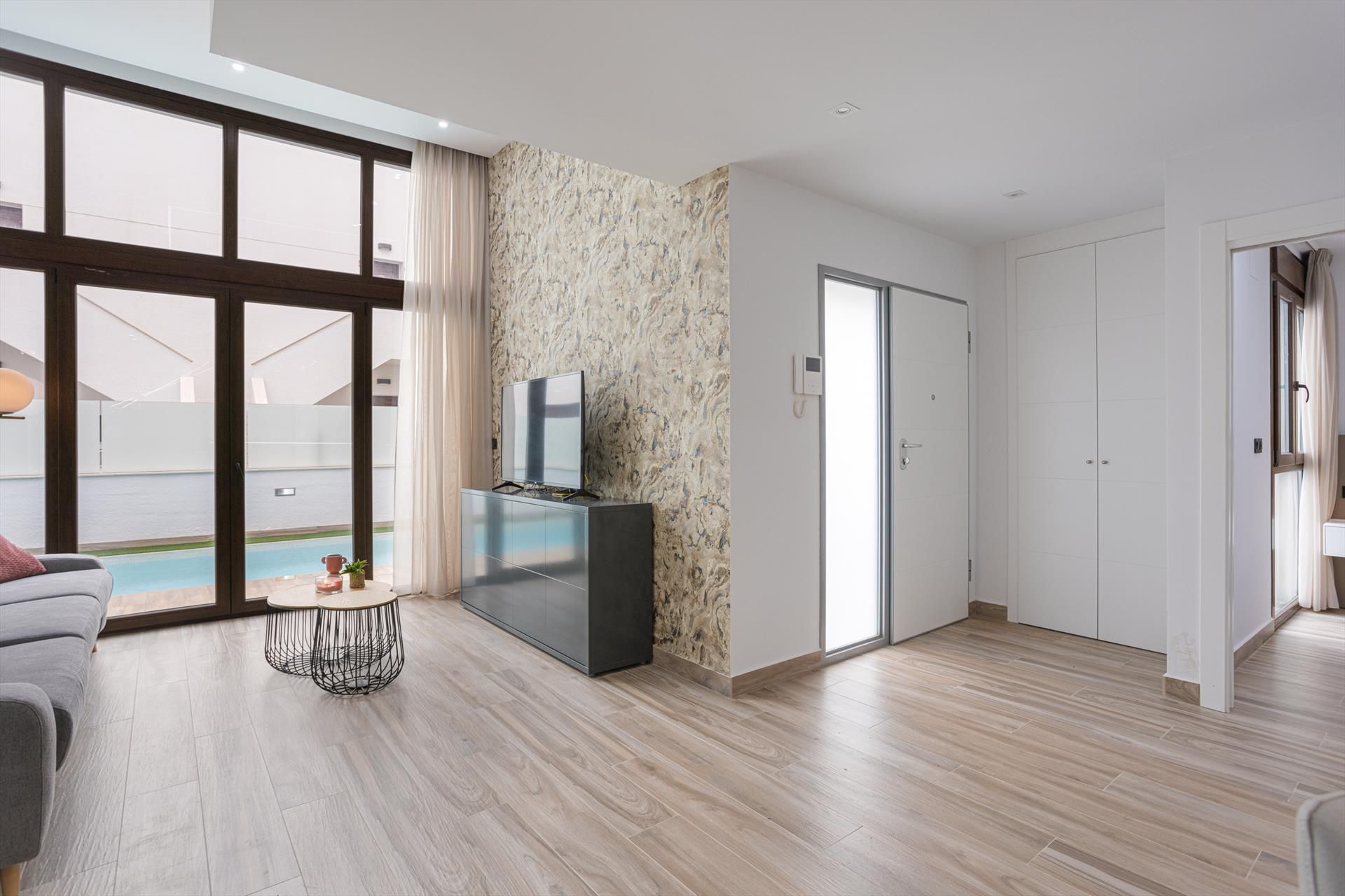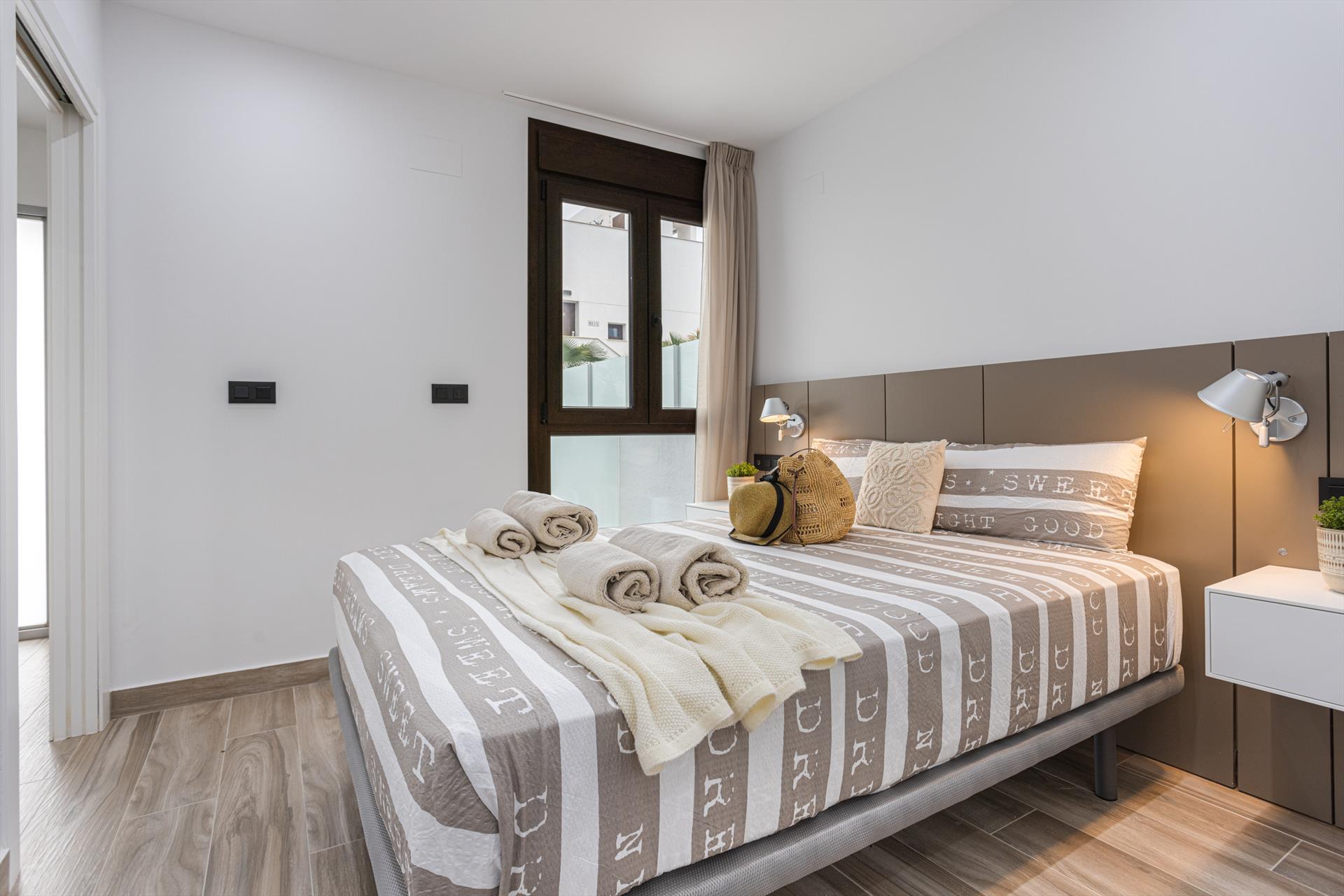 Modern and comfortable luxury villa in Torrevieja, Costa Blanca, Spain with private and communal pools for 6 persons. The villa is situated in a resort, close to restaurants and bars, shops and supermarkets, and 4 km from the beach.