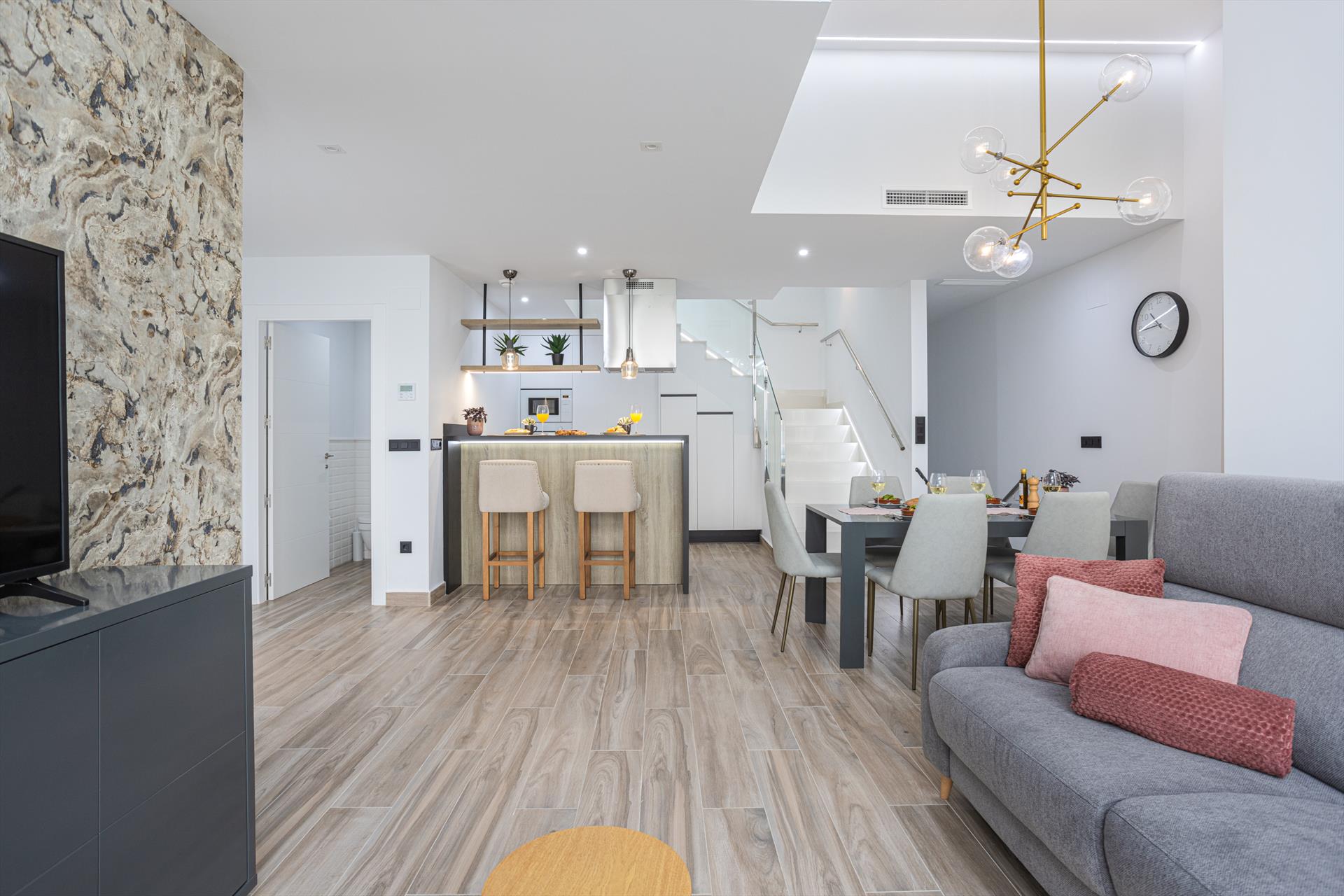 The luxury villa has 3 bedrooms, 2 bathrooms and 1 guest toilet, spread over 2 levels. The accommodation offers privacy, a lawned communal garden and a beautiful heated pool. Its comfort and the vicinity of the beach, places to shop, sports activities and places to go out make this a fine luxury villa to spend your holidays in Spain with family or friends.