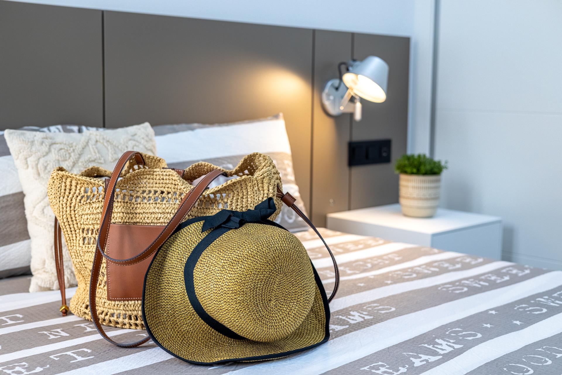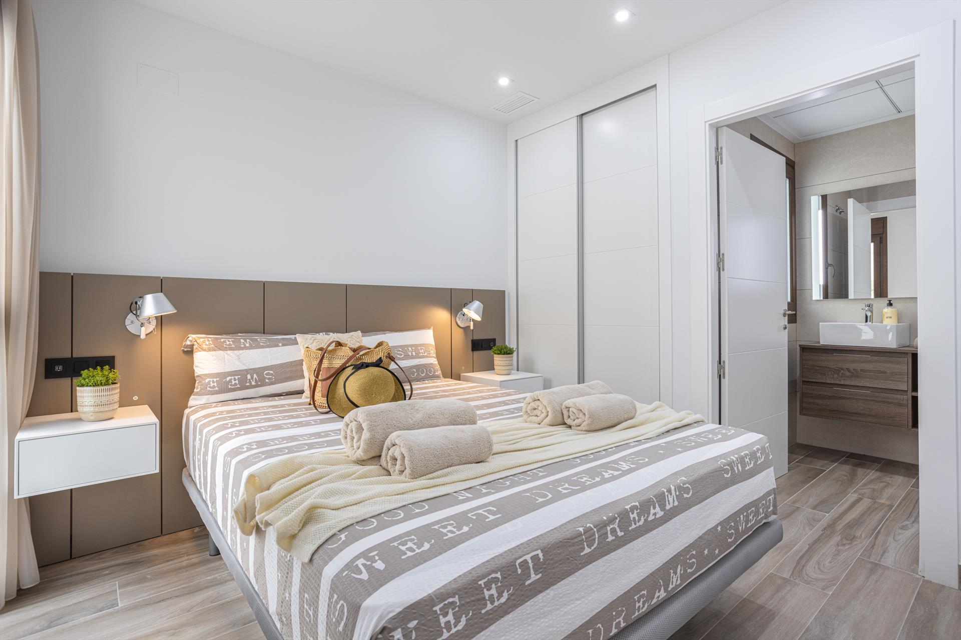 - bedroom with queen-size bed (measuring 200 by 160 cm) and en-suite bathroom