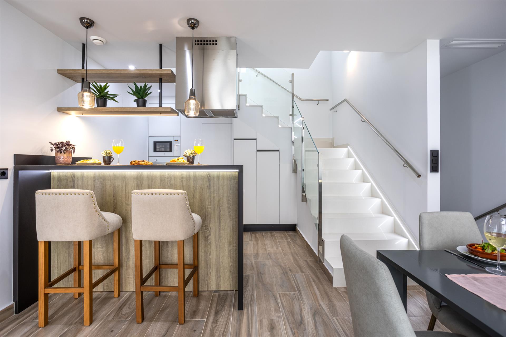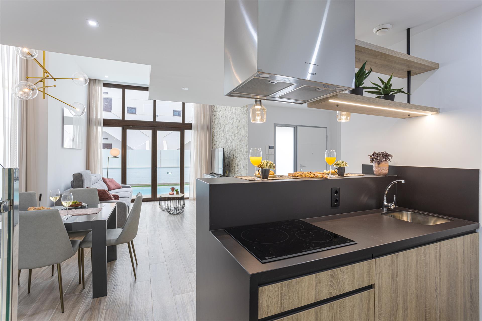 - open kitchen with electric hob, electric oven, microwave, dishwasher, refrigerator-freezer, coffee machine, electric kettle and toaster